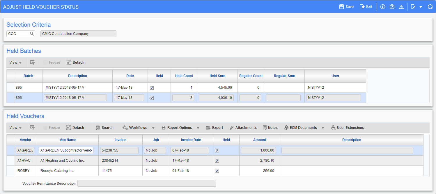 The Held Batches section lists batches containing held vouchers, and the Held Vouchers section lists the vouchers in the batch selected in the Held Batches section.