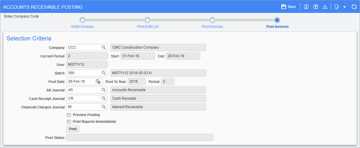 Pgm: ARPSTFM – Accounts Receivable Posting; standard Treeview path; standard Treeview path: Accounts Receivable > Invoice > Post Batches