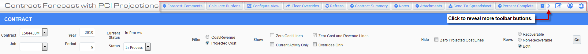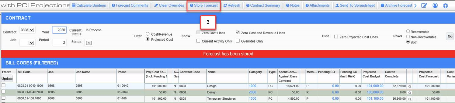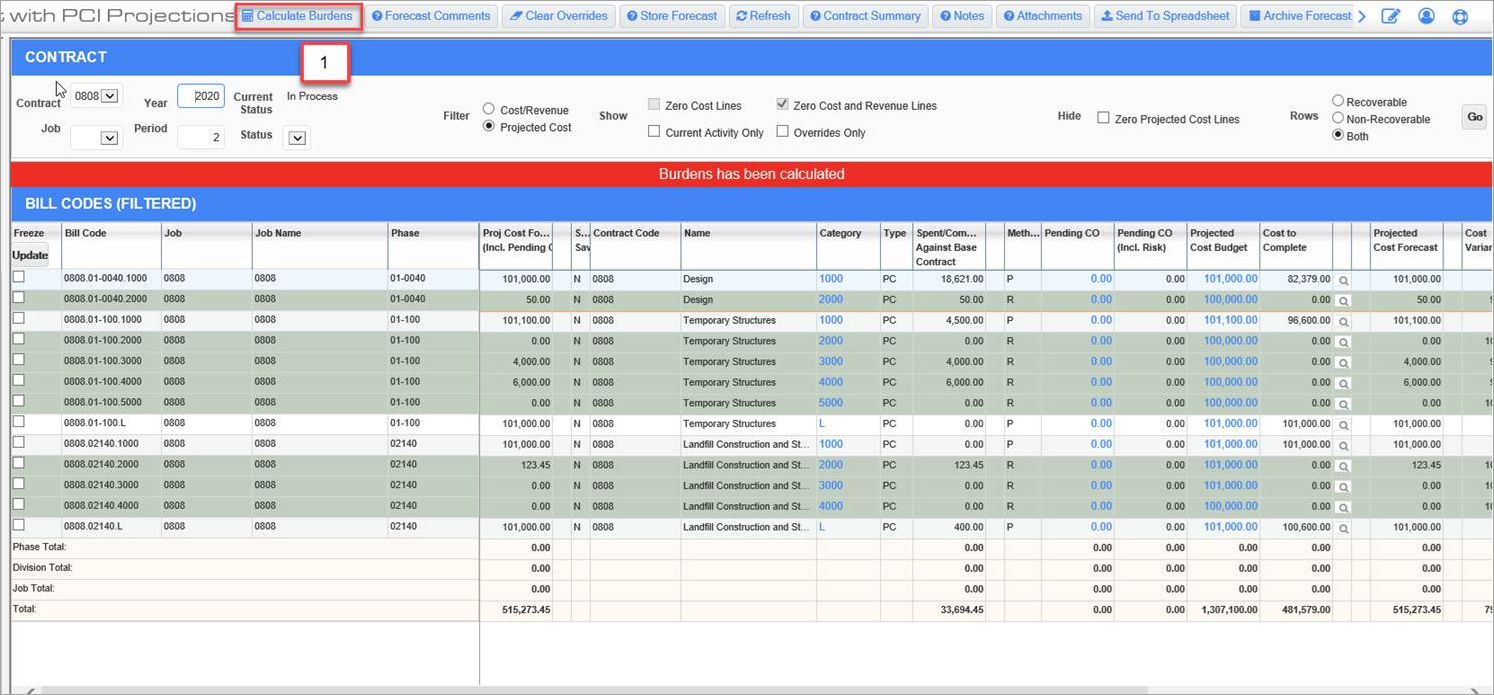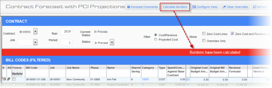 Example of Contract Forecast with PCI Projections screen after burdens have been calculated