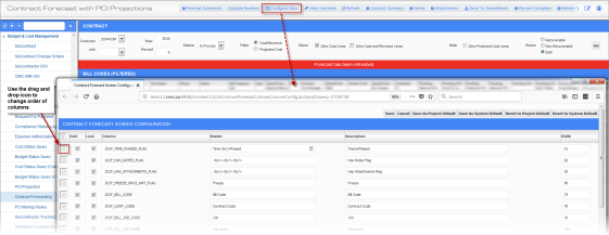The pop-up configuration window lists all the columns in the Contract Forecast with PCI Projections screen and provides the following functionality: