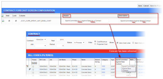 Header: The description entered in this field appears as the table column header in the Contract Forecast with PCI Projections screen. (This field replaces the prompt maintenance functionality.)