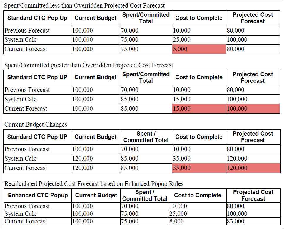 If one or both of the above conditions are true, and the system calculates a Projected Cost Forecast that is different from the previously stored forecast, and the user had overridden the Projected Cost Forecast in the previously stored forecast, then the program will function as follows: |