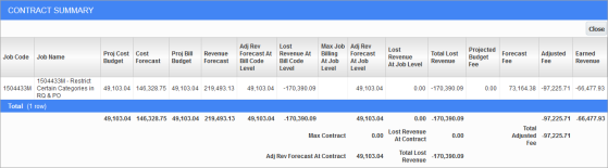 The Contract Summary pop-up window provides summary information for all the jobs under the contract, with key column values for cost, revenue, and lost revenue if any.