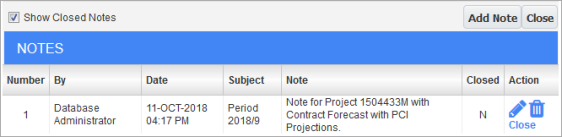 Pop-up window launched from the [Notes] button on the Contract Forecast with PCI Projections screen