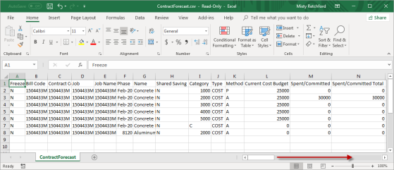 The [Send to Spreadsheet] functionality can be used with CMiC MIP (Microsoft Integration Program). Users can send data from the contract forecast columns to spreadsheet, either based on a previously stored template or without a template. This allows users to perform further analysis on the forecasting details.