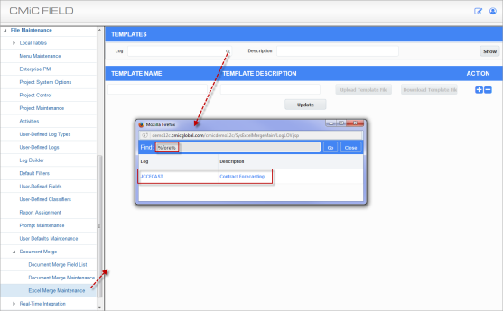 Users can create their own templates using the Excel Merge Maintenance screen. The log to select in this screen is “JCCFCAST – Contract Forecasting”, as shown in the screenshot below.