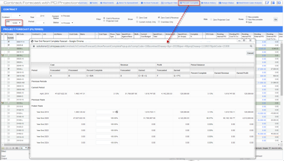 Pop-up window launched from the [Percent Complete] button on the Contract Forecast with PCI Projections screen