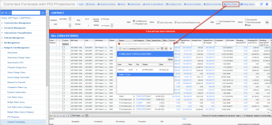 Pop-up window launched from the [Status History] button on the Contract Forecast with PCI Projections screen