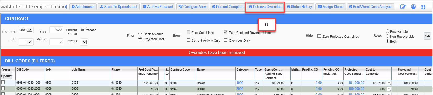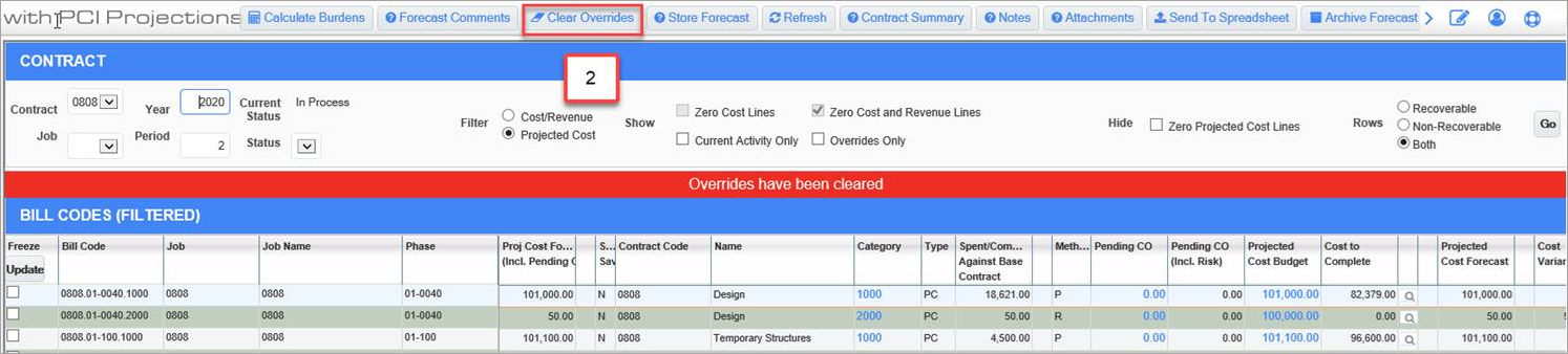 The [Clear Overrides] considers risk in the PCI Cost to Complete column. Users must refresh the Contract Forecast with PCI Projections screen to get the Projected Cost Forecast column to reflect the risk values as well.