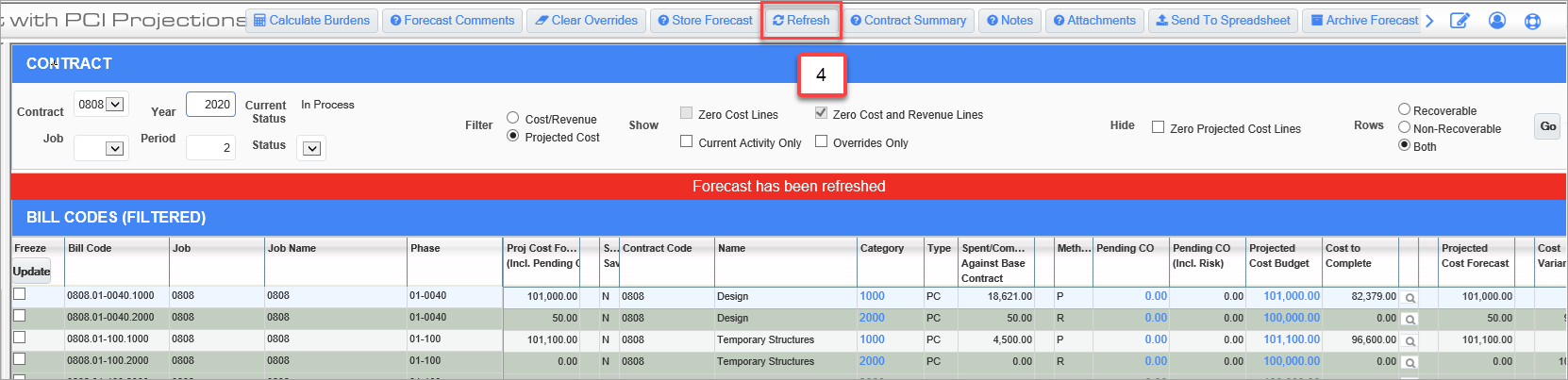 For example, refresh could be performed to include newly added bill codes to the forecast that were added to the contract.