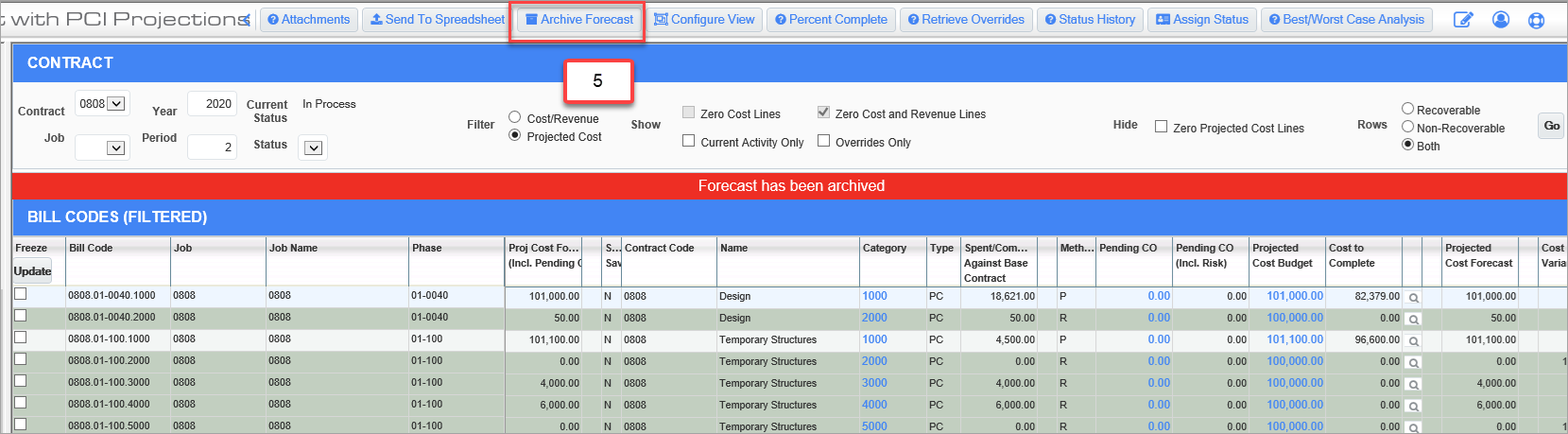 This function will store the forecast details as a snapshot for the contract or controlling job as queried on the screen in a table named JCCONTFORECAST_JSP_ARCHIVE. This stored data from CMiC Field’s Contract Forecast with PCI Projections screen may be used for any analysis in the future.