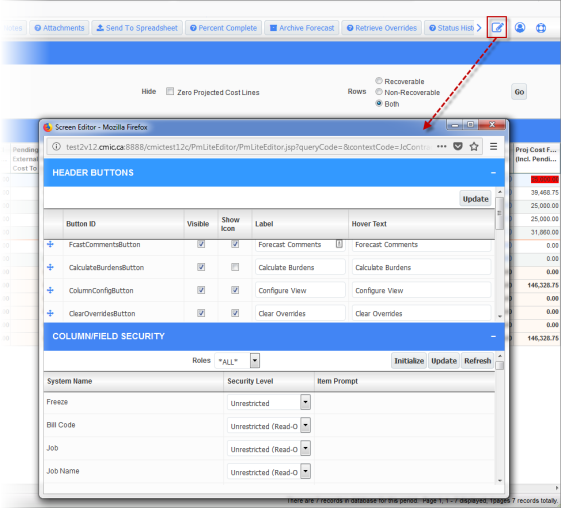 Pop-up window launched from Screen Editor icon on the Contract Forecast with PCI Projections screen