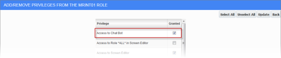 Access to the Chat Bot is granted by adding the privilege to the user’s security role (standard Treeview path: CMiC Field > Security > Role Maintenance).