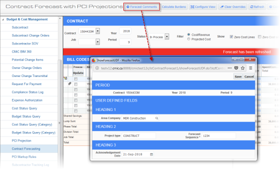 Forecast UDF pop-up window launched from the [Forecast Comments] button on the Contract Forecast with PCI Projections screen