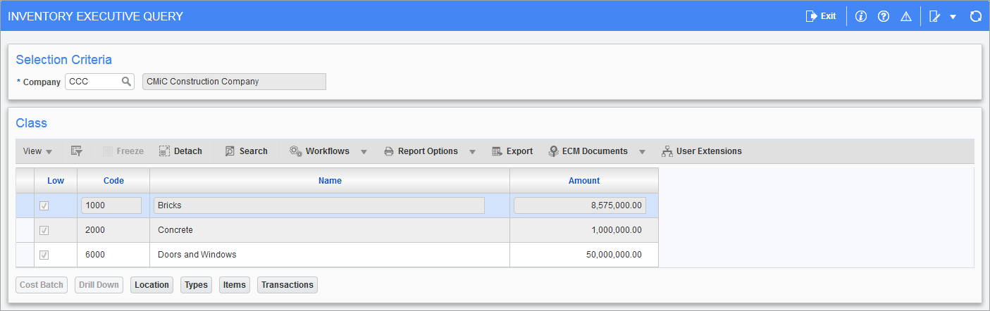 The Inventory Executive Query screen shows the inventory values in a variety of methods. The system returns inventory value based on the class total, which can then be broken down by location, inventory type, inventory items, and transactions, using the buttons along the bottom of the screen.