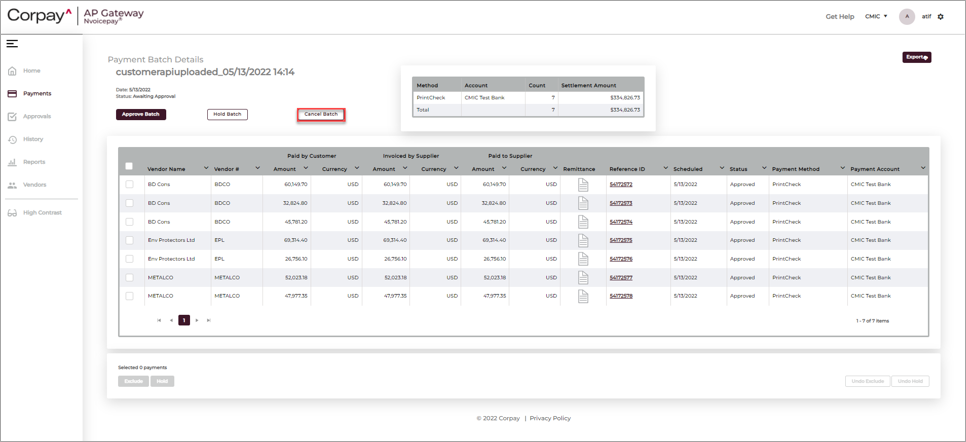 NOTE: Since the Cancel Batch option sets the batch as voided, users must take manual action in the CMiC application and cancel payments as required.