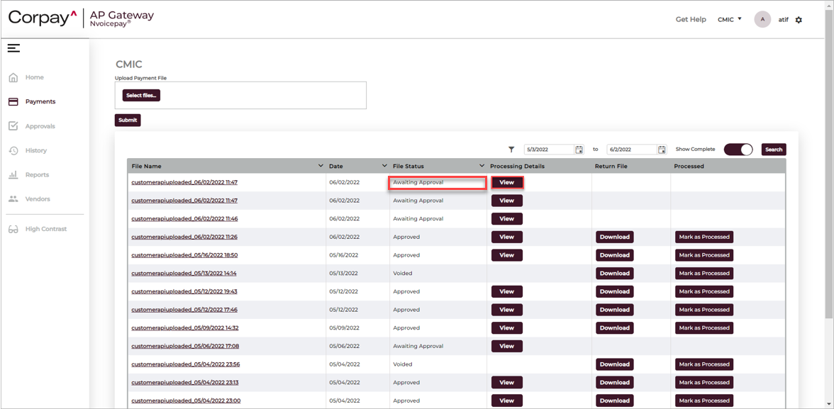 Click on the [View] button to approve the file which is awaiting approval. The File Status column will indicate "Awaiting Approval".