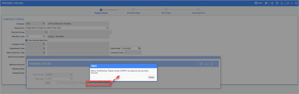 In the Prepare Checks pop-up window, click on [GetCorpay Batch Status] button. An alert message should be displayed to indicate that parsing has completed and that payments must be approved manually.