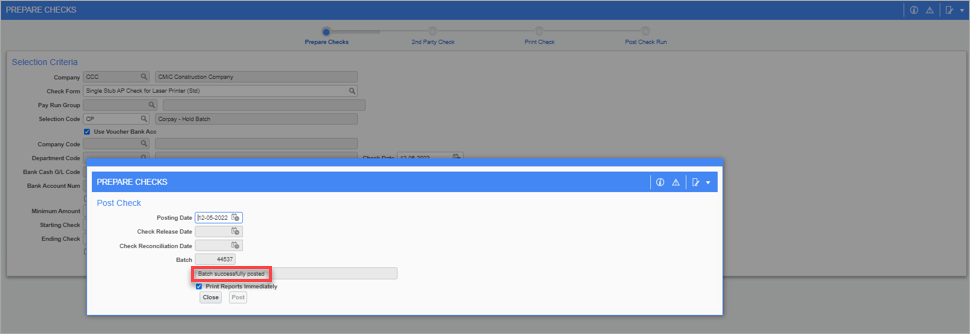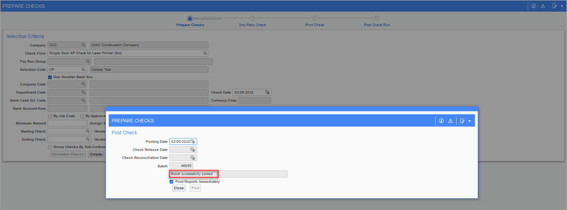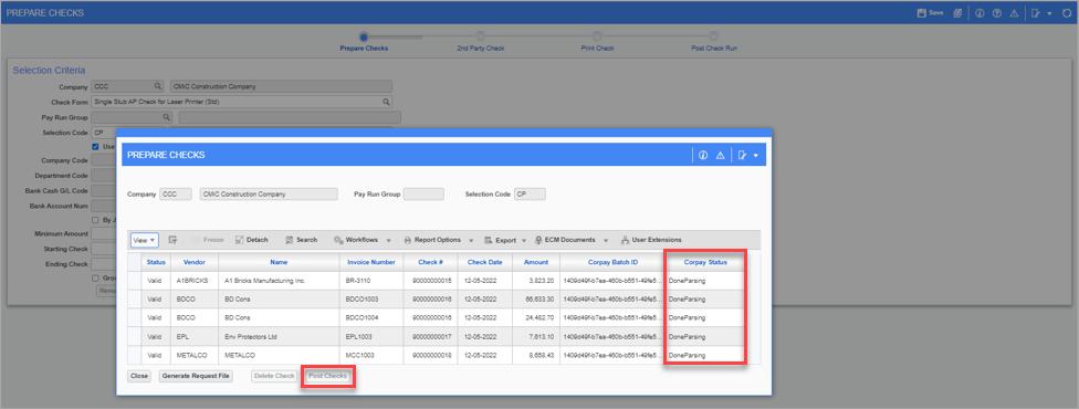 Pgm: APCHQPRE – Prepare Checks; standard Treeview path: Accounts Payable > Check > Print Checks - [Corpay] button pop-up - [Post Checks] button pop-up