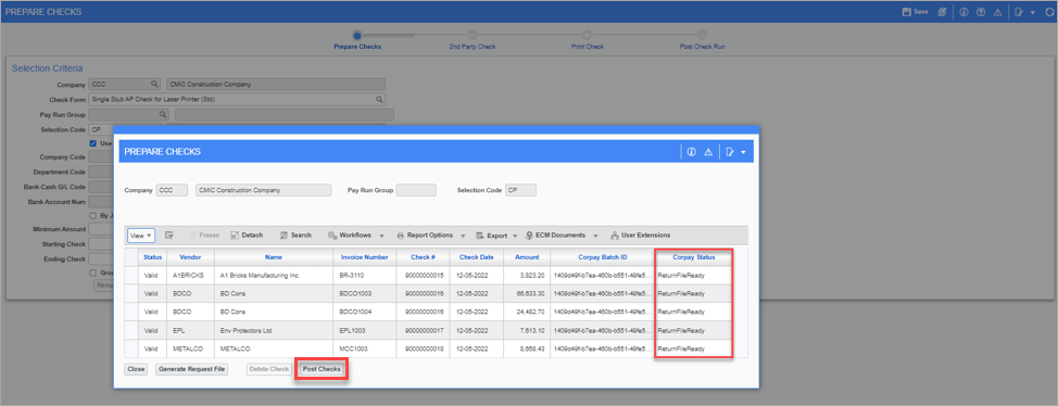 The [Post Checks] button is enabled in the Prepare Checks pop-up window when the Corpay Status column reads "ReturnFileReady". Click on the [Post Checks] button to begin the check posting process.