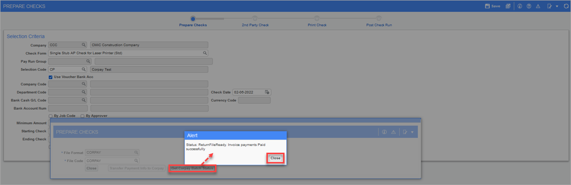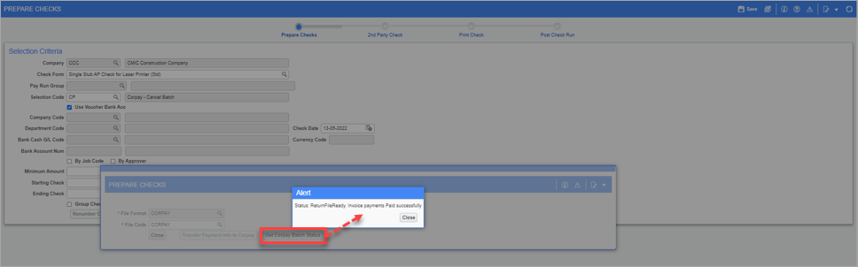 In the Prepare Checks pop-up window, click the [Get Corpay Batch Status] button. An alert message should indicate that the Corpay batch status has been updated to "ReturnFileReady".