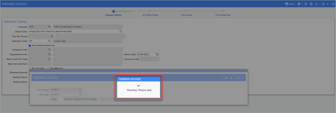 Once the payment is approved on AP Gateway, navigate to the Prepare Checks screen in the Accounts Payable module. Populate the same selection code as in Step 1. Click on the [Corpay] button to launch the Prepare Checks pop-up window.