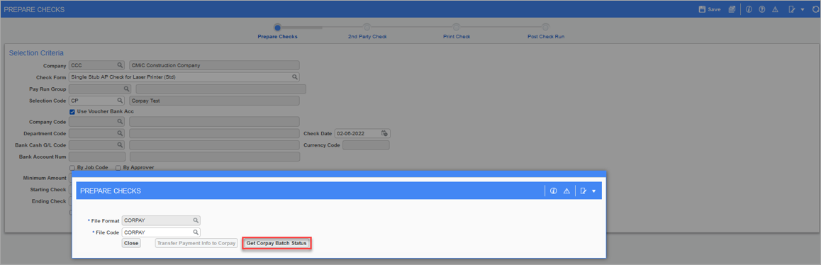 Pgm: APCHQPRE – Prepare Checks; standard Treeview path: Accounts Payable > Check > Print Checks - [Corpay] button pop-up - [Get Corpay Batch Status] button pop-up