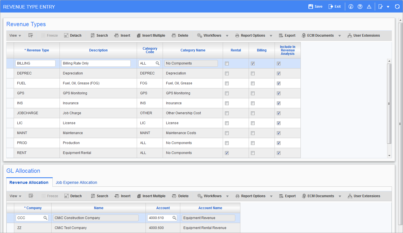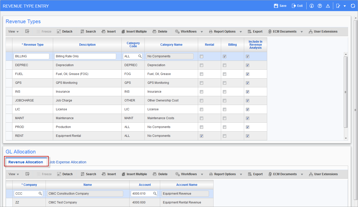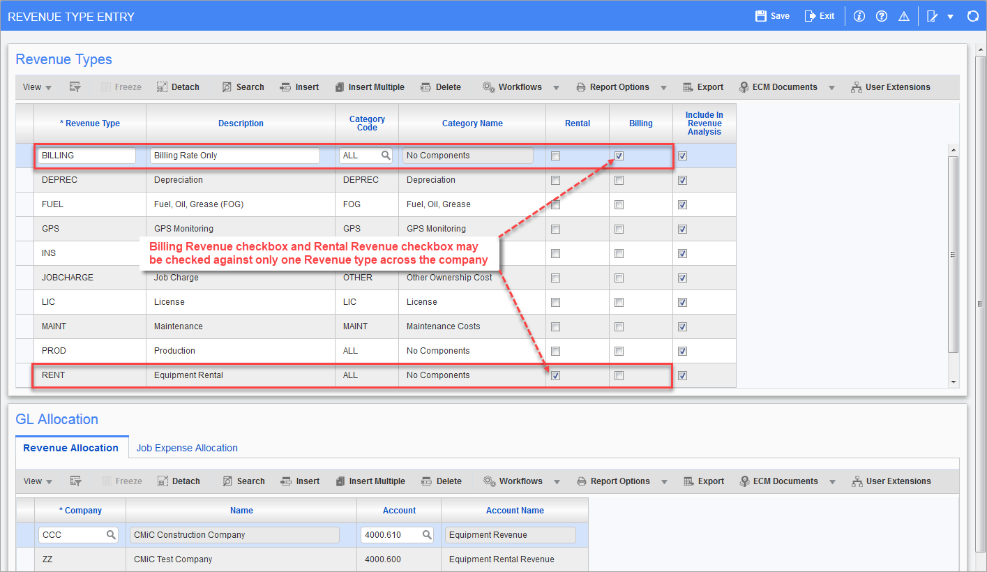 NOTE: Billing and Rental Revenue checkboxes can only be checked against one Revenue Type across the company.