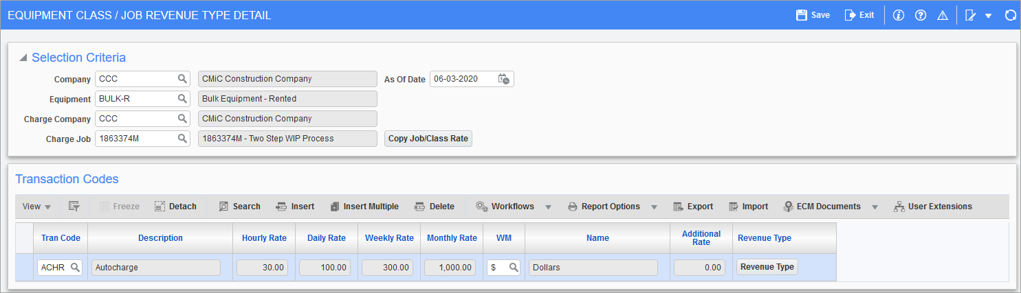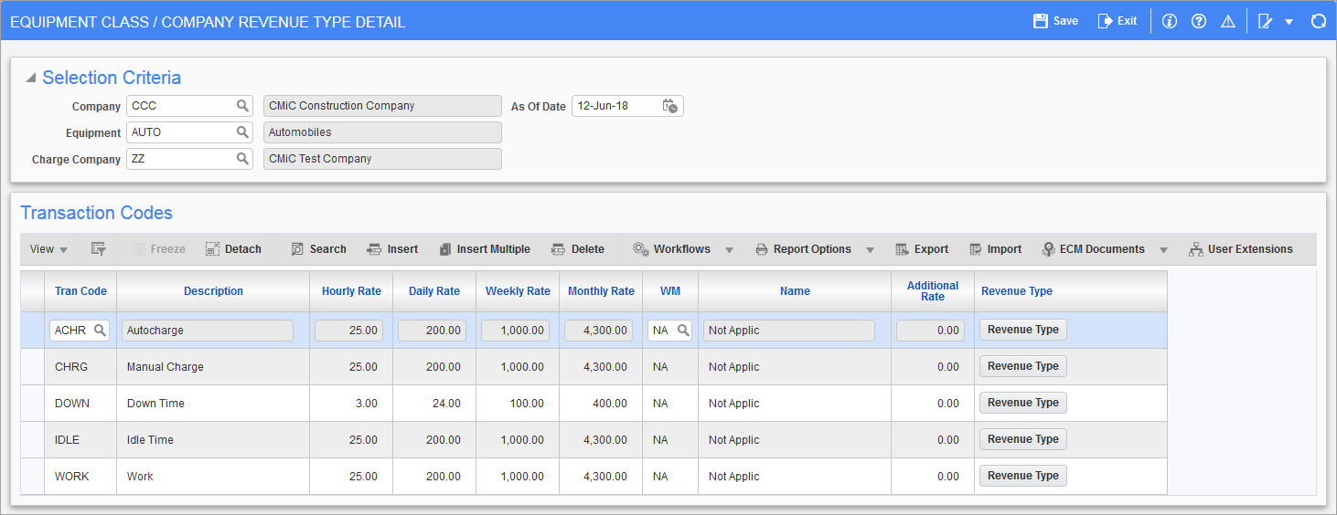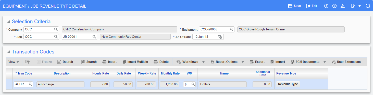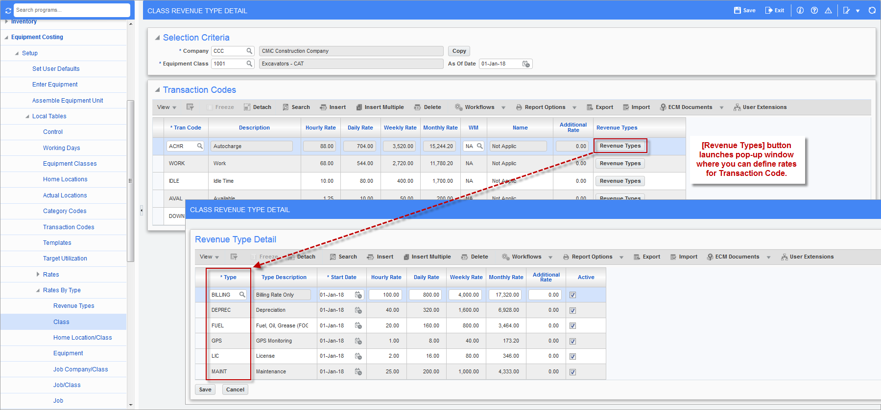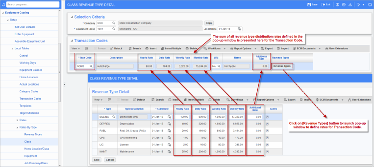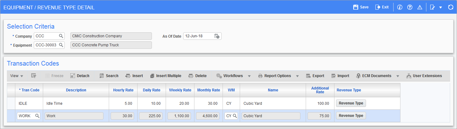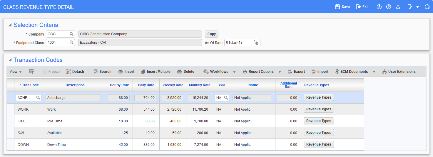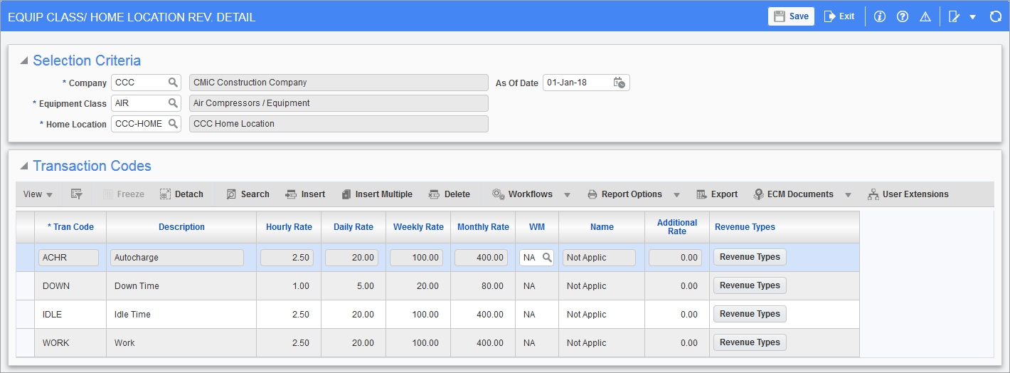 Rates by Type works with Revenue Transactions only and allows the functionality of adding a detail level with the breakup of hourly, daily, weekly and monthly rates as per the Rate Type for the combination of Equipment/Job/Transaction Code, Job/Equipment Class/Transaction Code, Job Company/Equipment Class/Transaction Code, Equipment/Transaction Code, Home Location/Equipment Class/Transaction Code, and Equipment Class/Transaction Code.