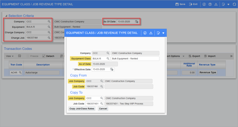 Before using this button, the fields in the Selection Criteria section on the Equipment Class/Job Revenue Type Detail screen must be completed. The values entered in this section of the screen default into the pop-up window, as highlighted in the screenshot above. For example, equipment class defaults from the main screen. The date in the Effective Date field is the date from which the copied rates would be effective in the new job. In the Copy To section, users must enter the same company and the job to which rates are to be copied.