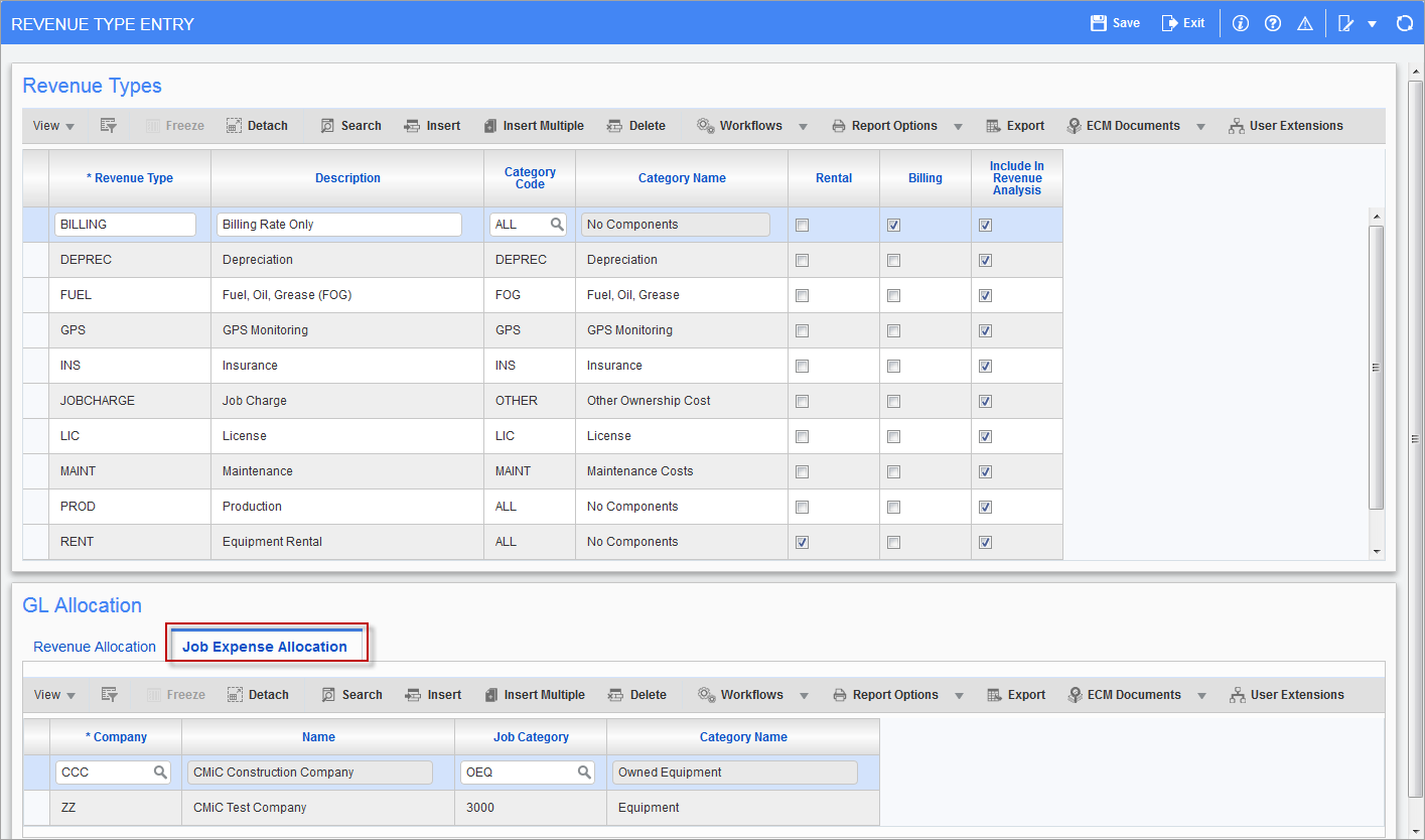 Pgm: EMRATETYPES – Rate Types – Job Expense Allocation; standard Treeview path: Equipment Costing > Setup > Local Tables > Rates By Type > Revenue Types – Job Expense Allocation tab