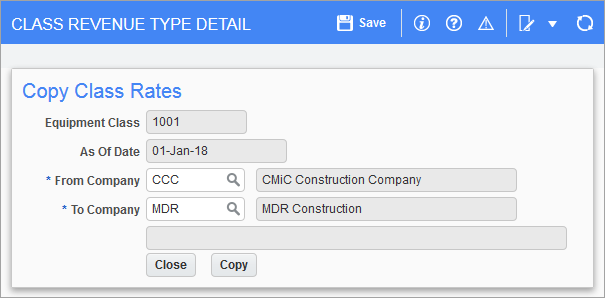 Pop-up window launched from [Copy Job/Class Rate] button on the Equipment Class/Job Revenue Type Detail screen