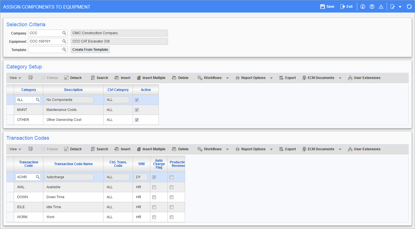 Pgm: EMEQCMTN – Assign Components To Equipment; standard Treeview path: Fixed Assets > Assets > Assign Cost Codes to Equipment