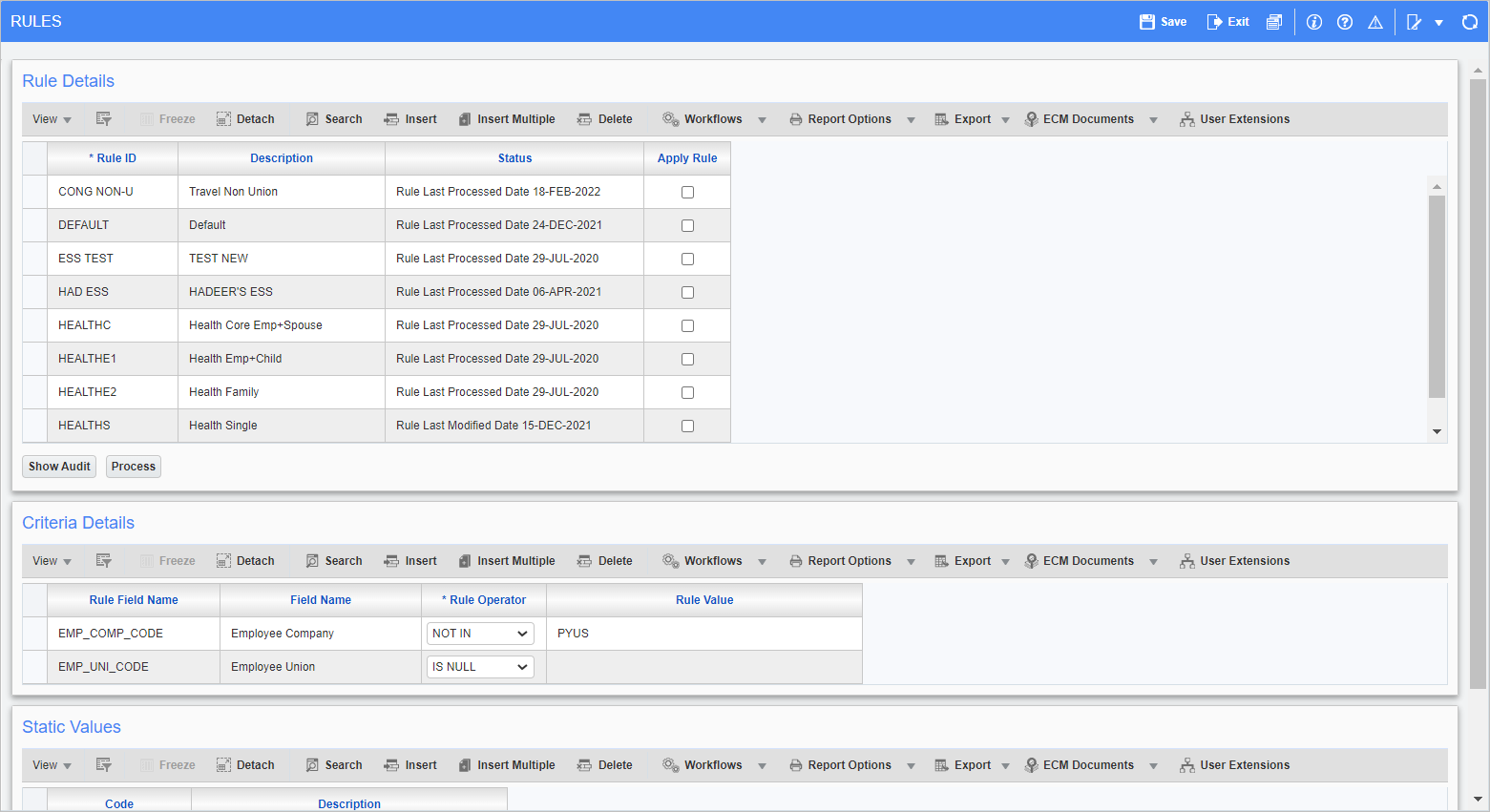 This section contains the basic rule information as well as options to process rules and view an audit of any changes made.