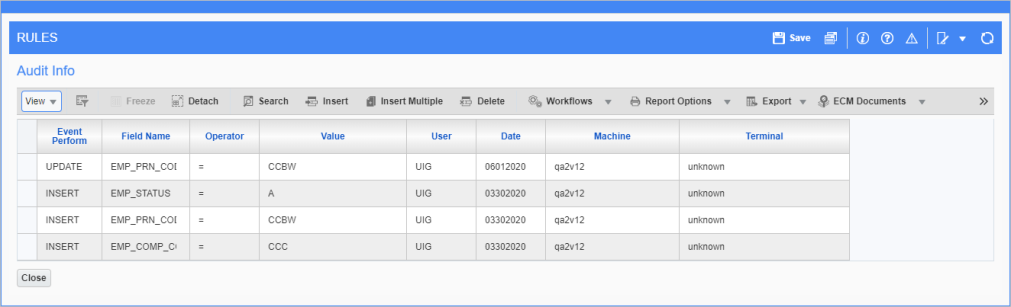 Select a rule and press this button to display a pop-up showing a full audit of any changes made to that rule.