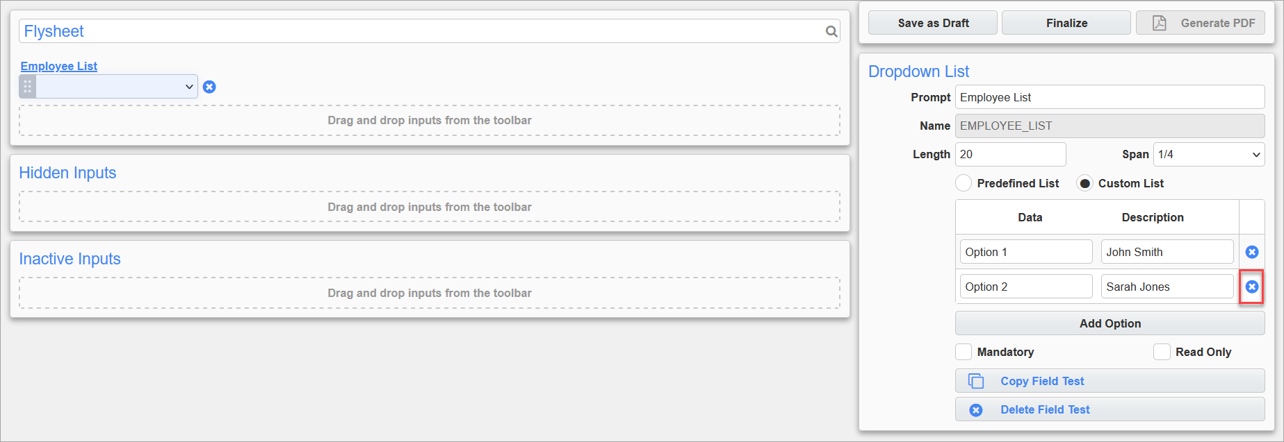 In the Dynamic Flysheet Builder, the Dropdown List and Radio Button inputs can be edited to use either a predefined list or a custom list created by the user.