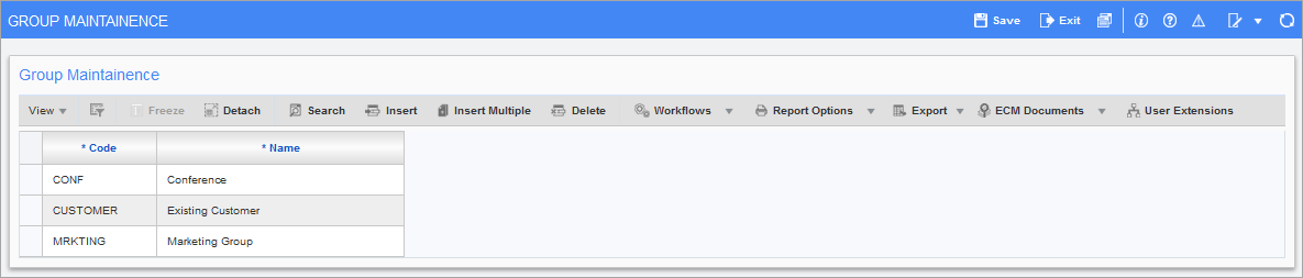 Pgm: OMGROUP - Groups Maintenance; standard Treeview path: Opportunity Management > Setup > Groups