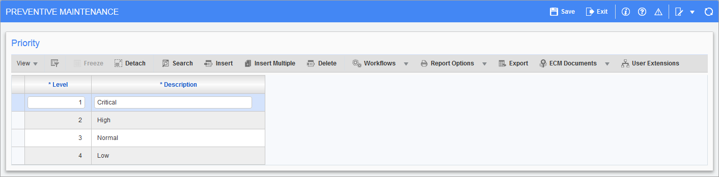 Pgm: PRMPRIOR – Priority Levels; standard Treeview path: Preventive Maintenance > Setup > Local Tables > Priority Levels