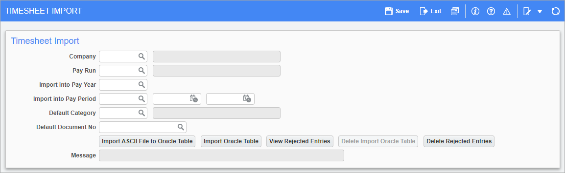 This button allows users to import data directly from the Oracle Timesheet table PYEMPTIMSHT_IMP. The import utility considers the fields for Expense Code and Expense QTY/Amount. The Import Timesheets from Oracle program validates the expense code defined in payroll setup, based on the expense type and Qty/Amount fields.