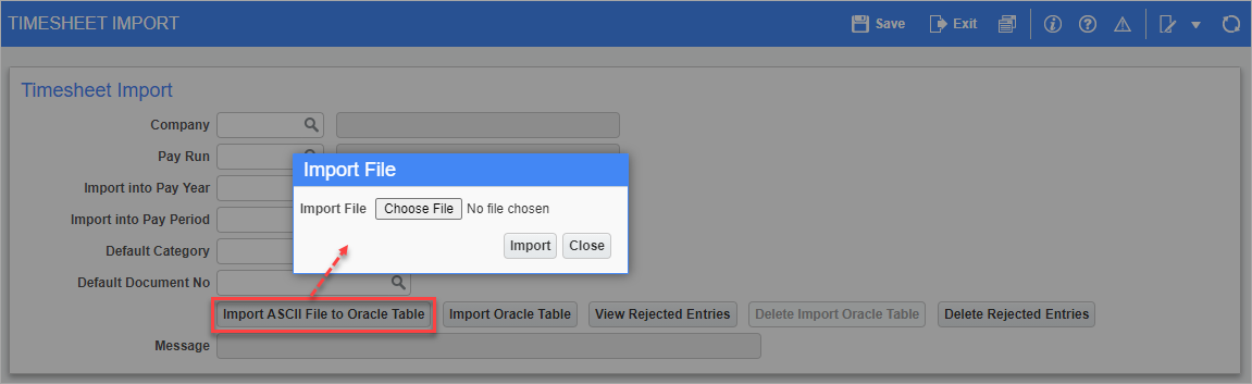 The [Import ASCII File to Oracle Table] button allows users to directly import an ASCII file to the Oracle Timesheet table PYEMPTIMSHT_IMP. This button is enabled if there is no information entered on this screen. It will open an Import File pop-up window for importing the ASCII file.