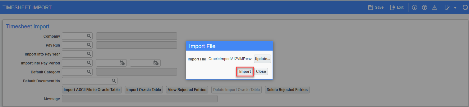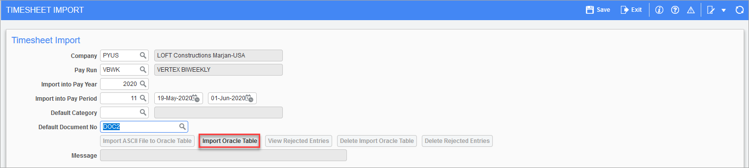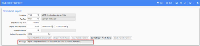 Then, the temporary table’s data is imported into Payroll as unposted Timesheets using the [Import Oracle Table] button.