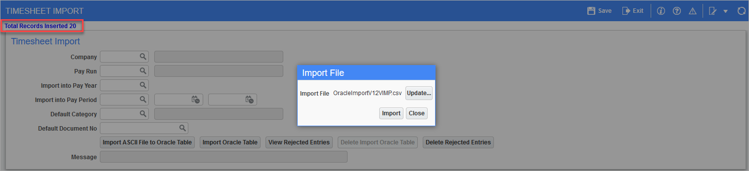 The number of lines read and imported will be displayed. Once the import is complete and the Import File pop-up is closed, the Oracle Timesheet Import procedure can begin. Rate calculation considers the shift code when determining the rate. The program will consider and include the fields for Expense Type and Expense Qty/Amt.