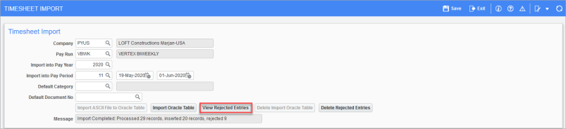 The [View Rejected Entries] button opens a screen with rejected entries where users can edit the data until all record are valid. When the records are rectified and valid, press the [Import] button on the Rejected Timesheet Entries screen to import the corrected entry record and insert into the timesheet.