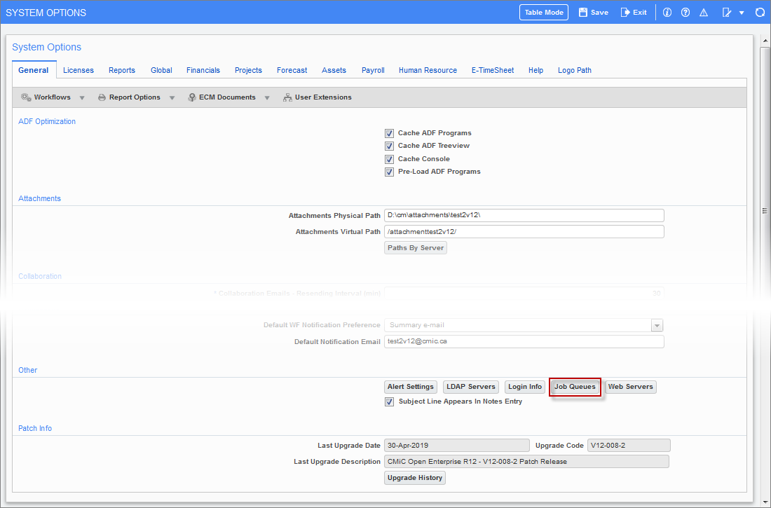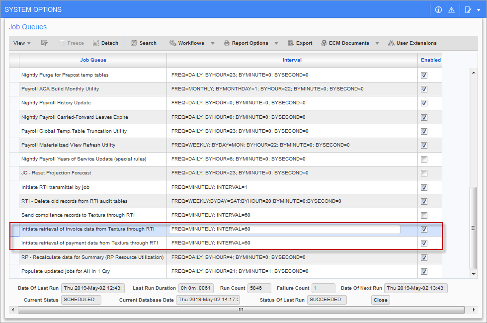 The Job Queue is used to retrieve invoices and payments from Textura, and to send compliance records to Textura. The jobs must be enabled in order to initiate the process.