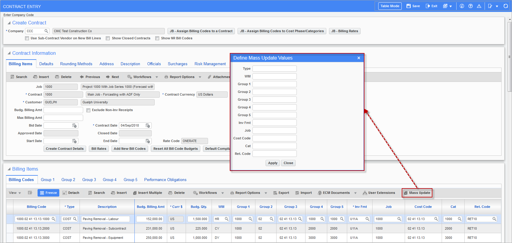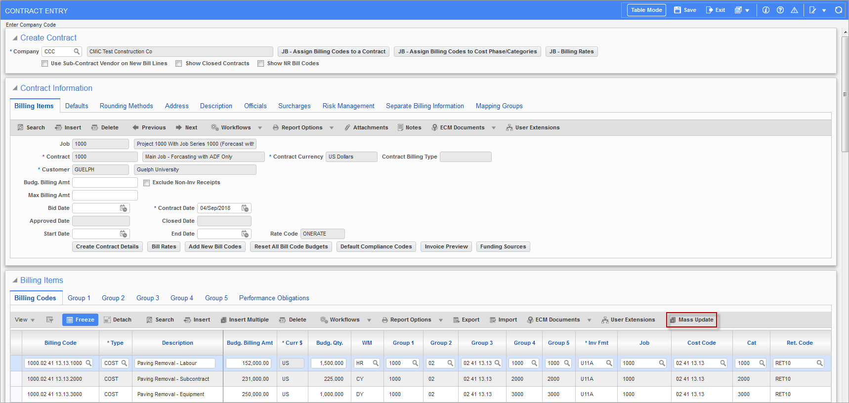 As framed in red above, the Contract Entry screen has a [Mass Update] button on the Block Toolbar for the Billing Codes tab.