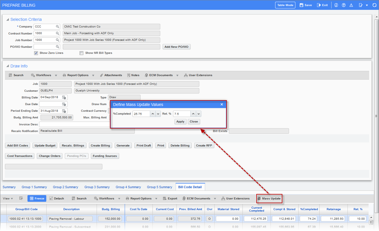 As framed in red above, the G/C Prepare Billing screen has a [Mass Update] button on the Block Toolbar of the Group 1 Summary to Group 5 Summary tabs, and on the Bill Code Detail tab.