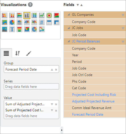 Add the JC Categories folder to the data fields. Move the fields into the Group, Series, and Value property boxes as shown above. This stacked column chart will break down the projected cost by category code.