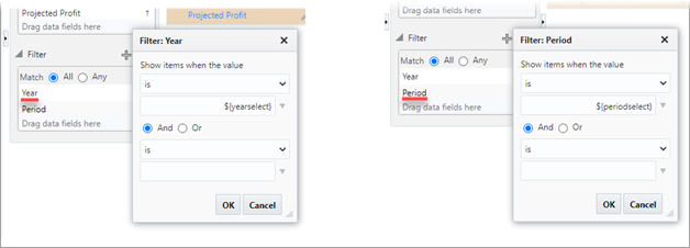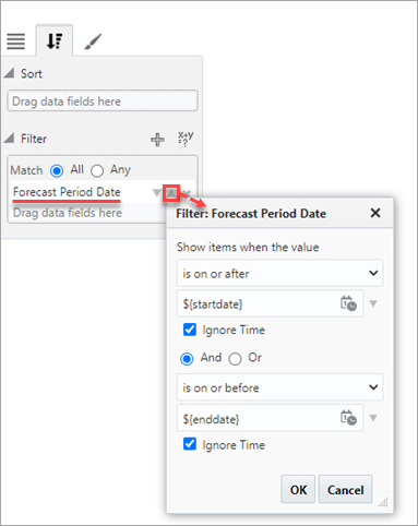 Implement the start and end date filters on both column charts by bringing the Forecast Period Date field (the one created earlier in Catalog Builder) into the Filter property box.