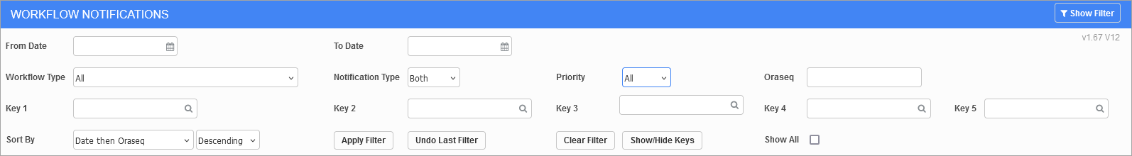 Workflow Notifications; standard Treeview path: Workflow > Notification List - [Show Filter] button